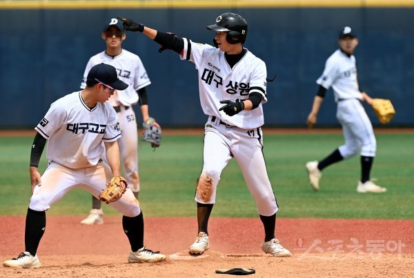21일 서울 목동야구장에서 ‘제 77회 황금사자기 전국고교야구대회 겸 주말리그 왕중왕전’ 대구고와 대구상원고의 경기가 열렸다. 7회말 1사 2루에서 대구상원고 안준상이 1타점 2루타를 날린 후 환호하고 있다.