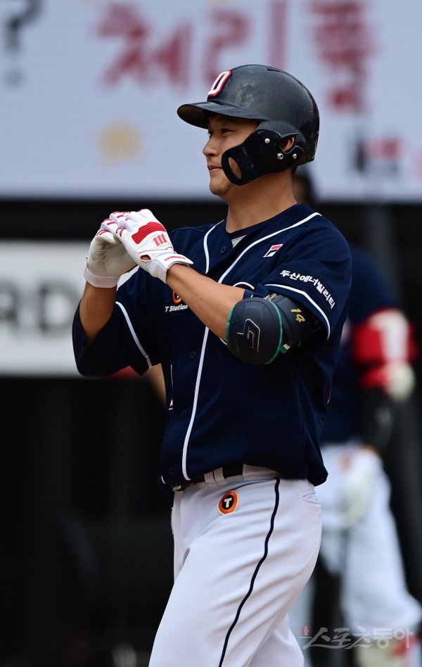 21일 경기도 수원KT위즈파크에서 열린 ‘2023 신한은행 SOL KBO리그’ KT 위즈와 두산 베어스의 경기에서 5회초 1사 1루 두산 박계범이 동점 좌월 투런 홈런을 친 후 세리머니를 하고 있다.