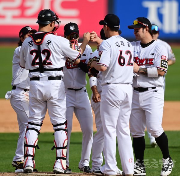 21일 경기도 수원KT위즈파크에서 열린 ‘2023 신한은행 SOL KBO리그’ KT 위즈와 두산 베어스의 경기에서 7-3으로 승리한 KT 선수들이 기쁨을 나누고 있다.