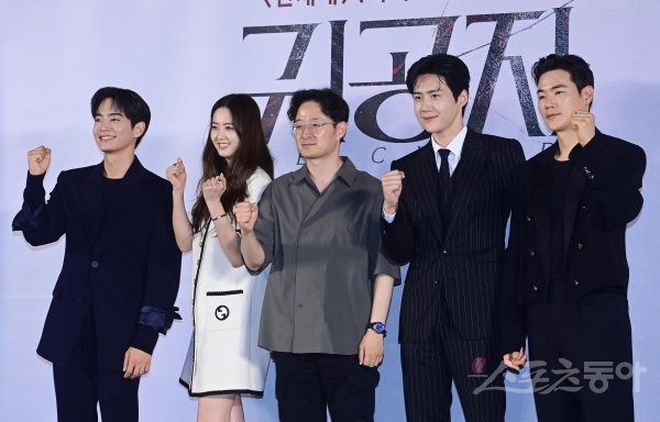 배우 강태주, 고아라, 감독 박훈정, 김선호, 김강우가 22일 서울 광진구 자양동 롯데시네마 건대입구점에서 열린 영화 ‘귀공자’ 제작보고회에서 포즈를 취하고 있다.