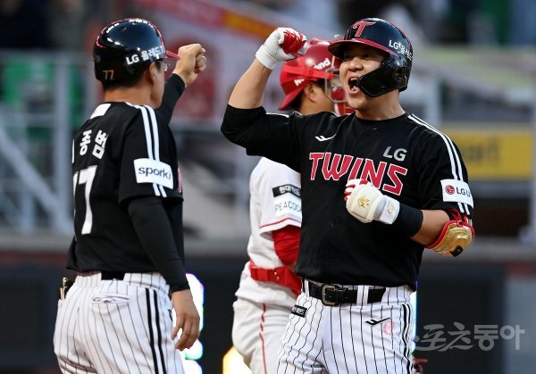 23일 인천 SSG 랜더스필드에서 ‘2023 신한은행 SOL KBO리그’ SSG 랜더스와 LG 트윈스의 경기가 열렸다. 4회초 2사 만루에서 LG 김민성이 역전 만루홈런을 쏘아 올린 후 코치의 환영을 받고 있다.