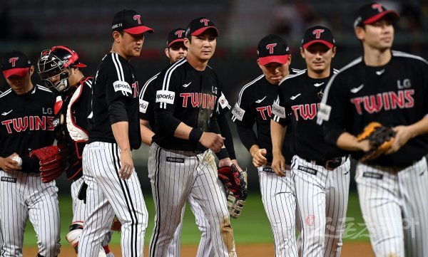 23일 인천 SSG 랜더스필드에서 ‘2023 신한은행 SOL KBO리그’ SSG 랜더스와 LG 트윈스의 경기가 열렸다. LG가 SSG를 상대로 9-1로 승리한 후 선수들이 그라운드에서 기쁨을 나누고 있다.