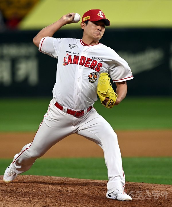 24일 인천 SSG 랜더스필드에서 ‘2023 신한은행 SOL KBO리그’ SSG 랜더스와 LG 트윈스의 경기가 열렸다. 7회초 2사 1루에서 SSG 노경은이 구원 등판해 볼을 던지고 있다.