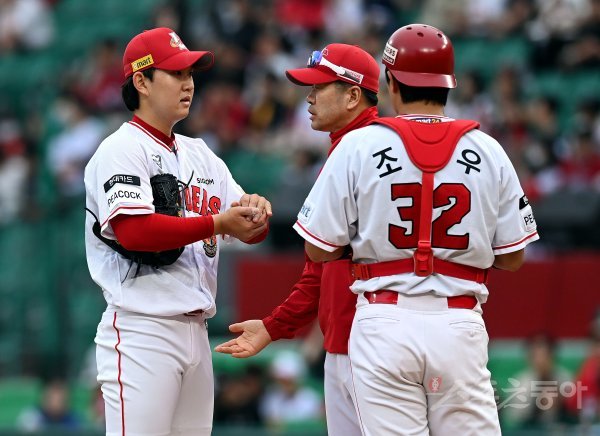 25일 인천 SSG 랜더스필드에서 ‘2023 신한은행 SOL KBO리그’ SSG 랜더스와 LG 트윈스의 경기가 열렸다. 1회초 무사 만루에서 SSG 선발 송영진이 마운드에 오른 조웅천 코치와 이야기를 나누고 있다.