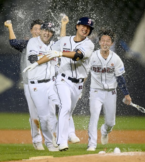 25일 서울 잠실야구장에서 ‘2023 신한은행 SOL KBO리그’ 삼성 라이온즈와 두산 베어스 경기가 열렸다. 연장 11회말 2사 만루 두산 김재호가 끝내기 안타를 친 후 환호하고 있다.