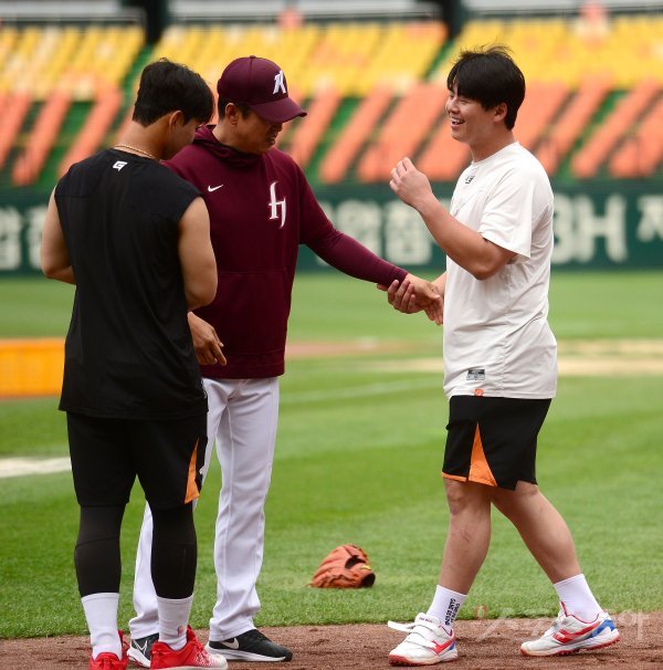 30일 대전 한화생명이글스파크 ‘2023 신한은행 SOL KBO리그’ 키움 히어로즈와 한화 이글스 경기가 열렸다. 경기 전 키움 채종국 코치와 한화 노시환이 이야기를 하고 있다.