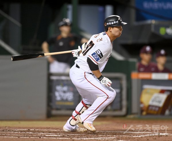 30일 대전 한화생명이글스파크 ‘2023 신한은행 SOL KBO리그’ 키움 히어로즈와 한화 이글스 경기가 열렸다. 6회말 무사 1,2루 한화 김건이 중전 안타를 치고 있다.