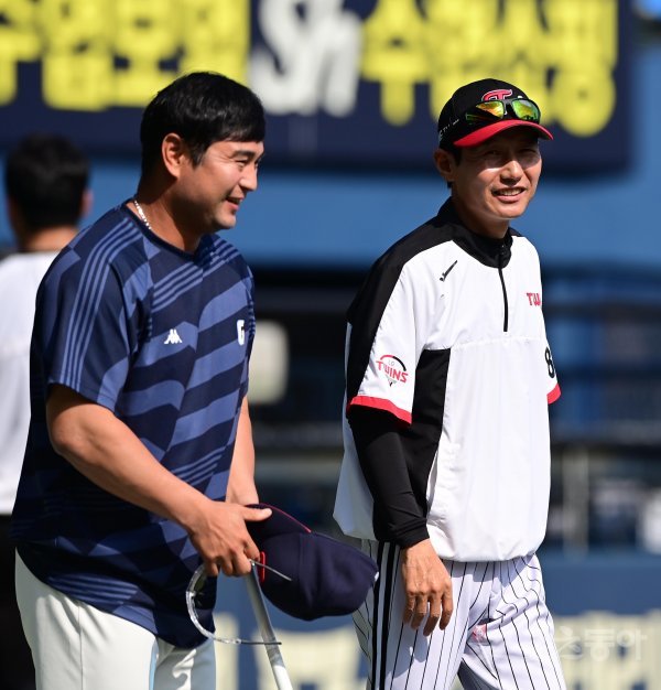 31일 서울 잠실야구장에서 열린 ‘2023 신한은행 SOL KBO리그’ LG 트윈스와 롯데 자이언츠의 경기에 앞서 롯데 최경철 코치와 LG 염경엽 감독이 인사하고 있다.