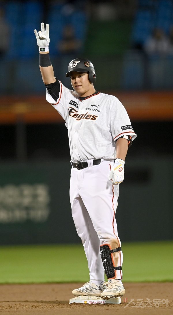 31일 대전 한화생명이글스파크 ‘2023 신한은행 SOL KBO리그’ 키움 히어로즈와 한화 이글스 경기가 열렸다. 6회말 2사 1,2루 한화 노시환이 2타점 중전 2루타를 치고 있다.