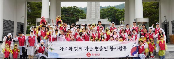 현충원 봉사활동 후 기념촬영을 하고 있는 롯데건설 임직원과 가족들. 사진제공|롯데건설
