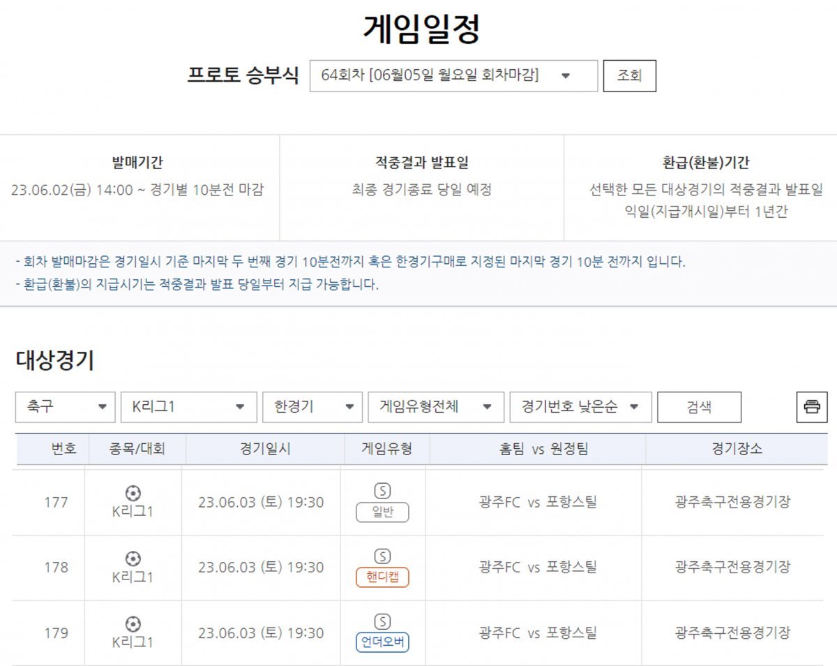 프로토 승부식 64회차 중 광주(홈)-포항(원정)전을 대상으로 한 ‘한경기구매’ 게임은 2일(금) 오후 2시부터 참여가 가능하며, ▲177번(일반) ▲178번(핸디캡) ▲179번(언더오버)의 각기 다른 3가지 방식으로 즐길 수 있다.