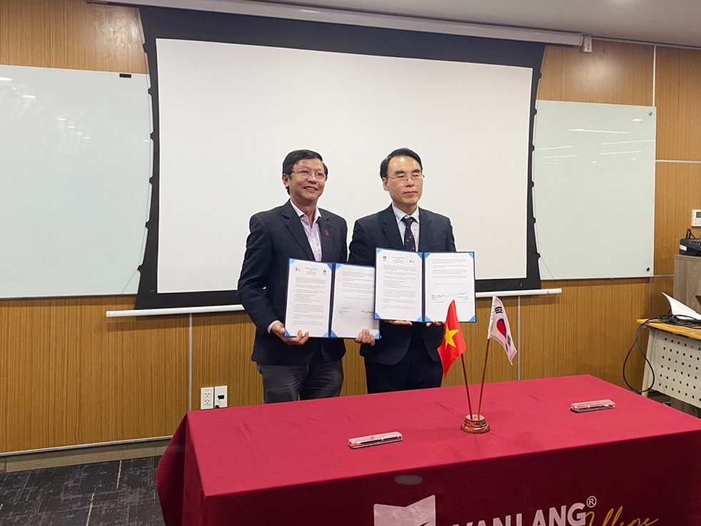 협약서 서명 후 기념촬영하는 김문섭 교학부총장(오른쪽)과 트루옹 반 훙 총장. 사진제공ㅣ대구한의대