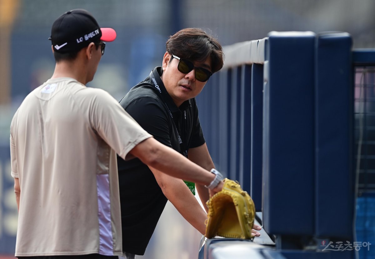 1일 서울 잠실야구장에서 열린 ‘2023 신한은행 SOL KBO리그’ LG 트윈스와 롯데 자이언츠의 경기에 앞서 정민철 해설위원이 불펜 피칭을 지켜보며 LG 코치와 이야기하고 있다.