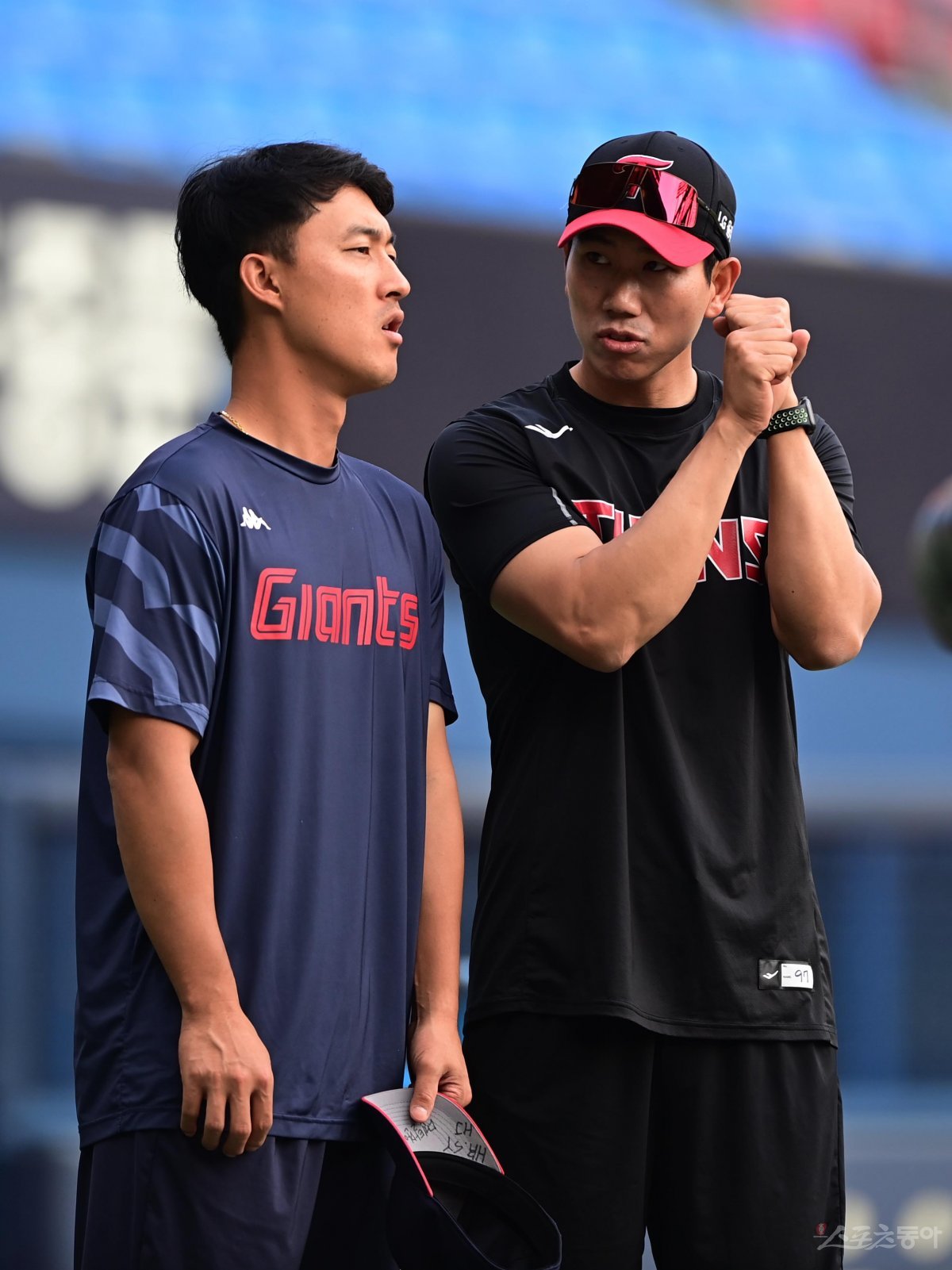 1일 서울 잠실야구장에서 열린 ‘2023 신한은행 SOL KBO리그’ LG 트윈스와 롯데 자이언츠의 경기에 앞서 롯데 노진혁과 LG 모창민 코치가 이야기를 하고 있다.