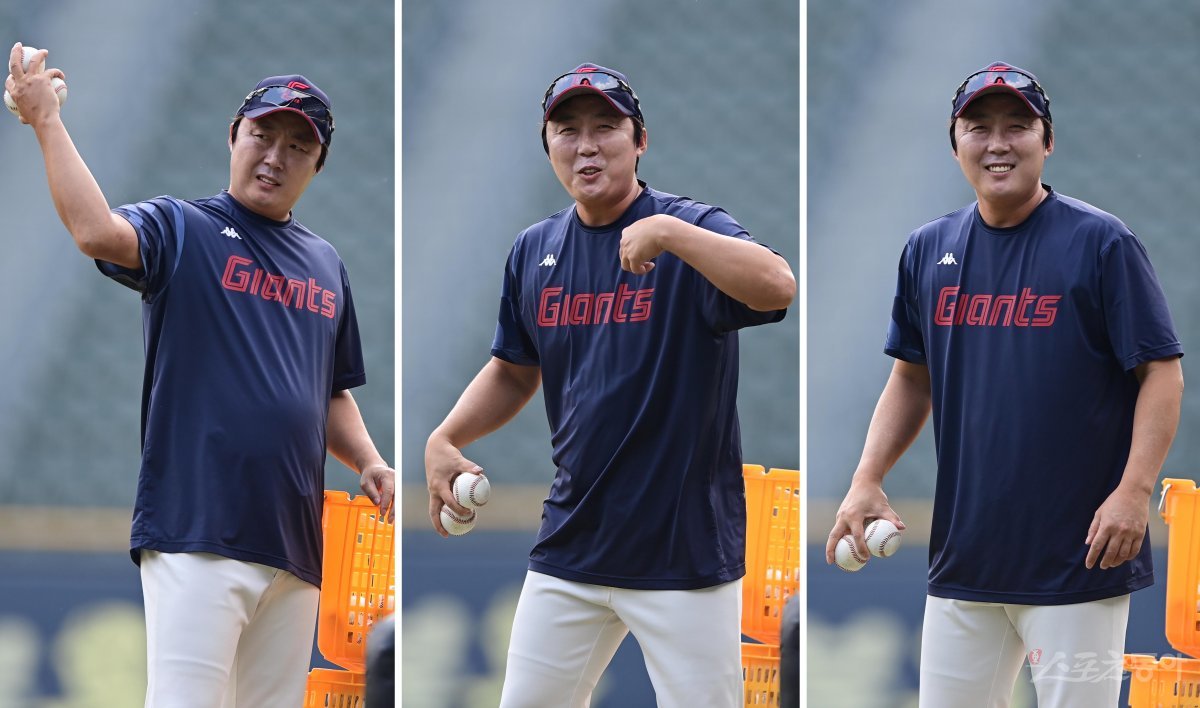1일 서울 잠실야구장에서 열린 ‘2023 신한은행 SOL KBO리그’ LG 트윈스와 롯데 자이언츠의 경기에 앞서 롯데 배영수 코치가 몸을 푸는 중에 취재진을 향해 손짓하고 있다.