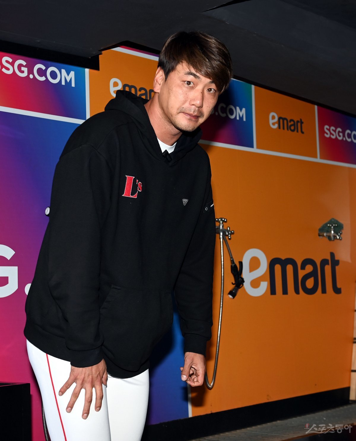 1일 인천 SSG 랜더스필드에서 ‘2023 신한은행 SOL KBO리그’ SSG 랜더스와 삼성 라이온즈의 경기가 열린다. 경기에 앞서 지난 WBC 야구대표팀 음주 논란의 당사자인 SSG 김광현이 기자들 앞에서 사과를 하고 있다.