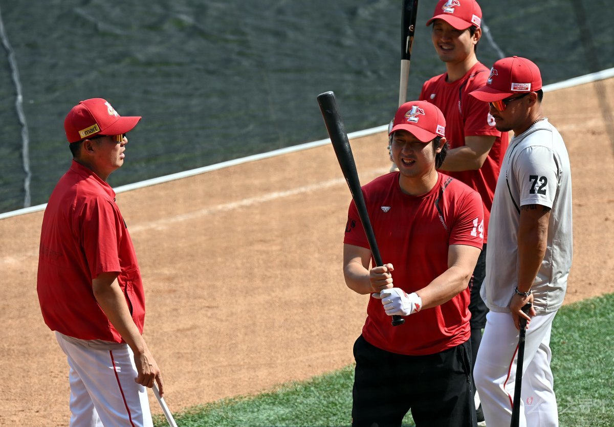 1일 인천 SSG 랜더스필드에서 ‘2023 신한은행 SOL KBO리그’ SSG 랜더스와 삼성 라이온즈의 경기가 열린다. 경기에 앞서 SSG 최정이 김원형 감독과 이야기를 나누고 있다.
