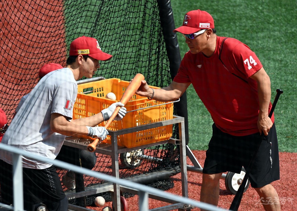 1일 인천 SSG 랜더스필드에서 ‘2023 신한은행 SOL KBO리그’ SSG 랜더스와 삼성 라이온즈의 경기가 열린다. 경기에 앞서 SSG 조원우 코치가 박성한의 번트 훈련을 지도하고 있다.