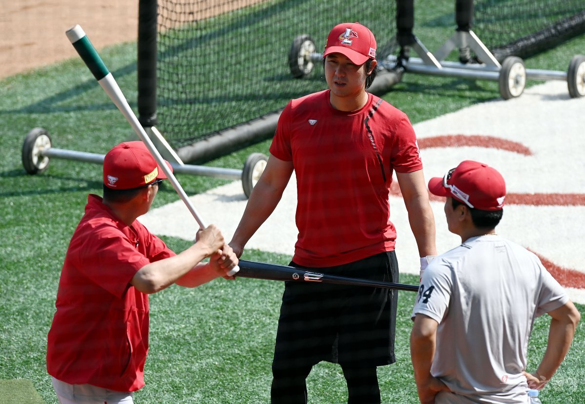 1일 인천 SSG 랜더스필드에서 ‘2023 신한은행 SOL KBO리그’ SSG 랜더스와 삼성 라이온즈의 경기가 열린다. 경기에 앞서 SSG 최정이 김원형 감독과 타격에 관해 이야기를 나누고 있다.