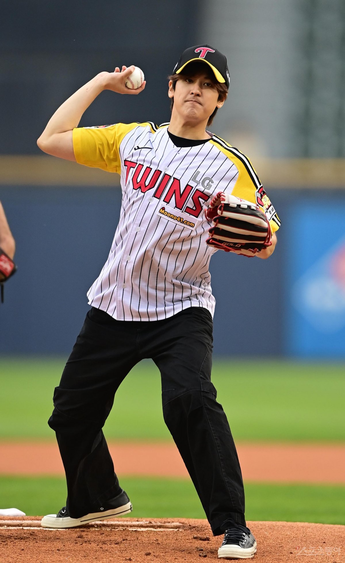 1일 서울 잠실야구장에서 열린 ‘2023 신한은행 SOL KBO리그’ LG 트윈스와 롯데 자이언츠의 경기에 앞서 그룹 아이콘 정찬우가 시구를 하고 있다.