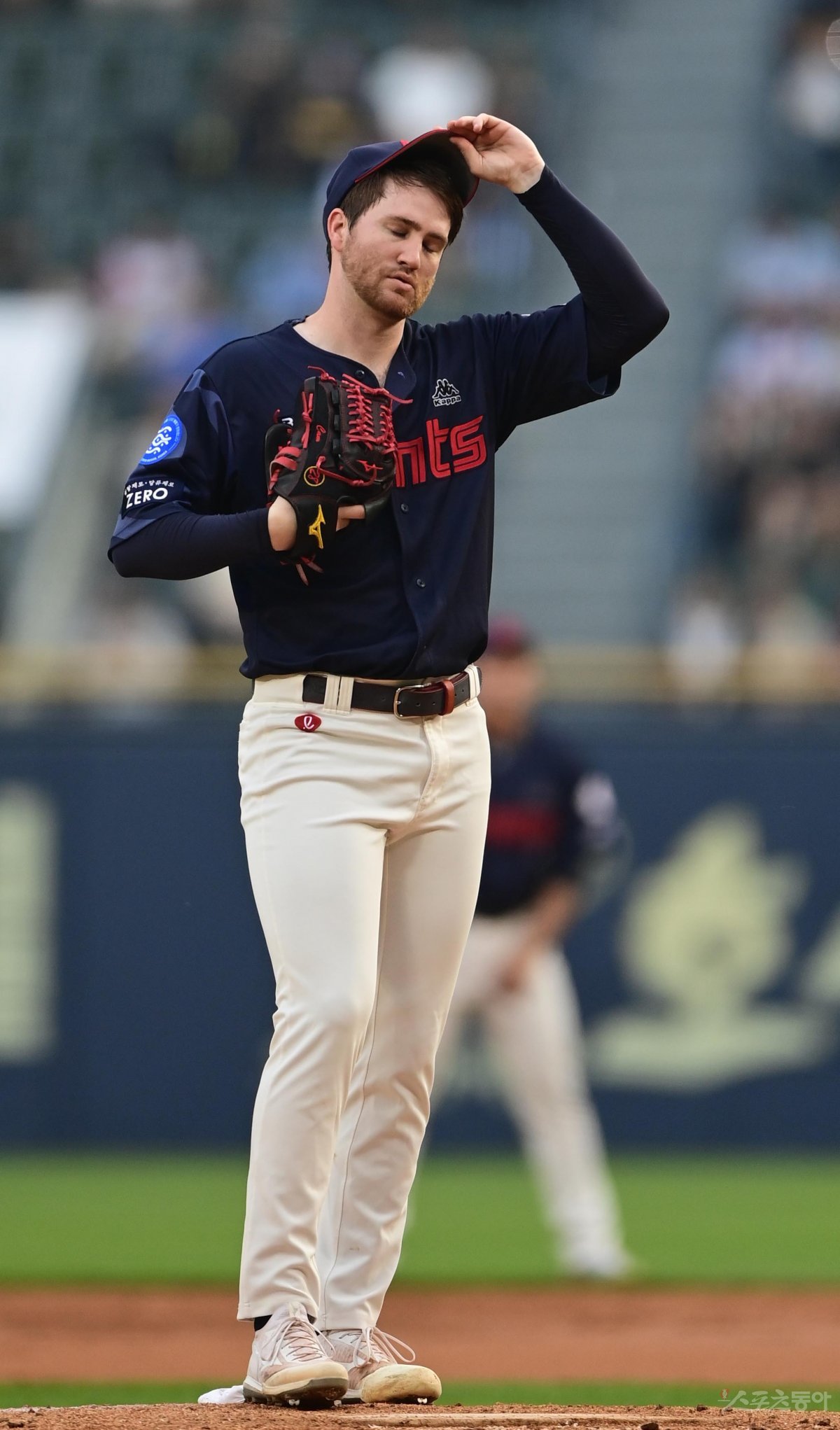 1일 서울 잠실야구장에서 열린 ‘2023 신한은행 SOL KBO리그’ LG 트윈스와 롯데 자이언츠의 경기에서 2회말 마운드에 오른 롯데 반즈가 모자를 고쳐쓰고 있다.