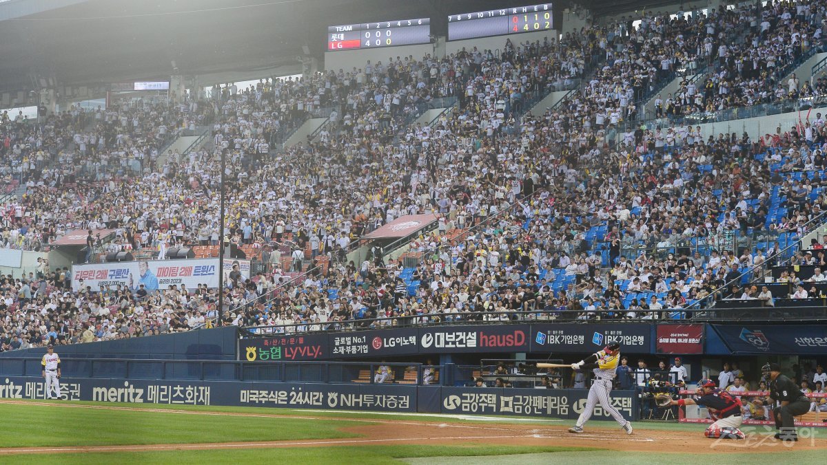 1일 서울 잠실야구장에서 열린 ‘2023 신한은행 SOL KBO리그’ LG 트윈스와 롯데 자이언츠의 경기에서 관중들이 응원을 하고 있다. 5년 만에 평일 3경기 연속 2만 관중을 돌파했다.