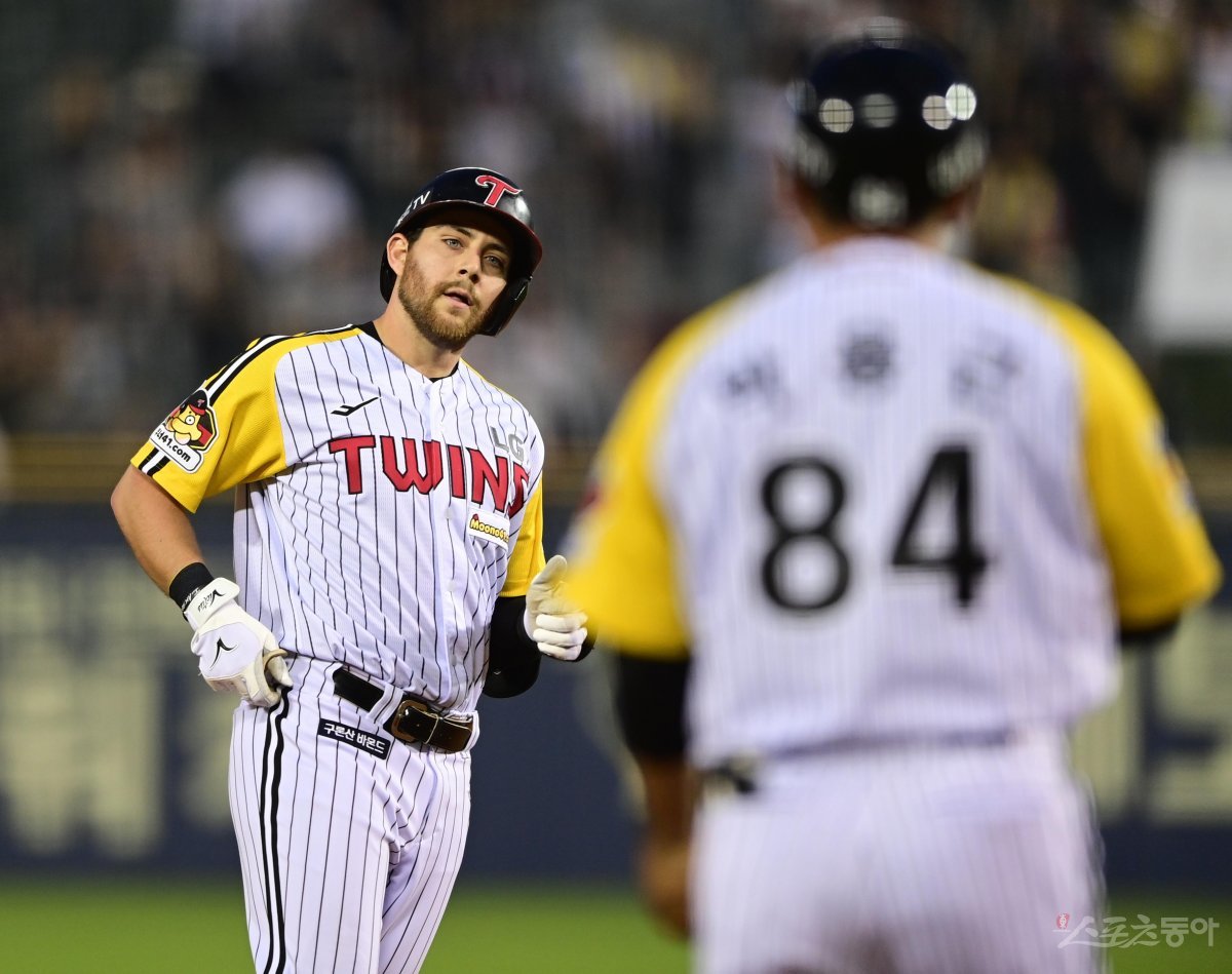 1일 서울 잠실야구장에서 열린 ‘2023 신한은행 SOL KBO리그’ LG 트윈스와 롯데 자이언츠의 경기에서 5회말 2사 2루 LG 오스틴이 1타점 중전 인정 2루타를 친 후 2루로 돌아가고 있다.