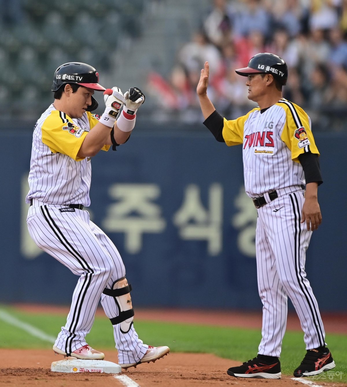 1일 서울 잠실야구장에서 열린 ‘2023 신한은행 SOL KBO리그’ LG 트윈스와 롯데 자이언츠의 경기에서 1회초 2사 2, 3루 LG 박동원이 2타점 좌전 적시타를 친 후 이종범 코치와 기쁨을 나누고 있다.