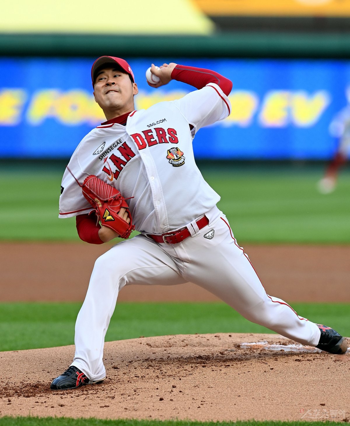 1일 인천 SSG 랜더스필드에서 ‘2023 신한은행 SOL KBO리그’ SSG 랜더스와 삼성 라이온즈의 경기가 열렸다. SSG 선발투수 백승건이 힘차게 볼을 던지고 있다.