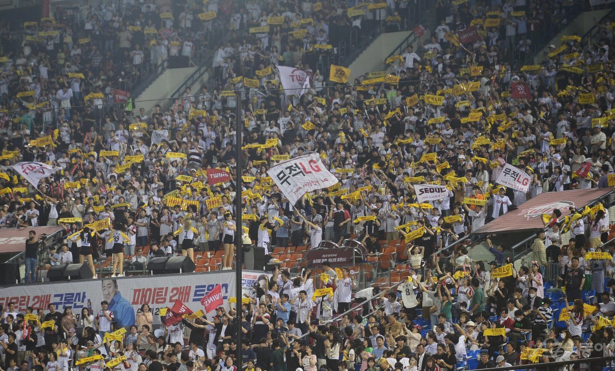 1일 서울 잠실야구장에서 열린 ‘2023 신한은행 SOL KBO리그’ LG 트윈스와 롯데 자이언츠의 경기에서 LG 팬들이 응원을 펼치고 있다.