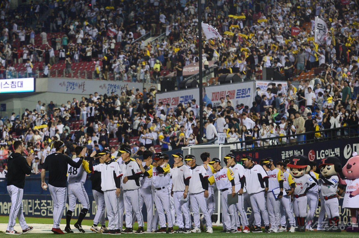 1일 서울 잠실야구장에서 열린 ‘2023 신한은행 SOL KBO리그’ LG 트윈스와 롯데 자이언츠의 경기에서 6-1로 승리한 LG 염경엽 감독이 선수들과 기쁨을 나누고 있다.