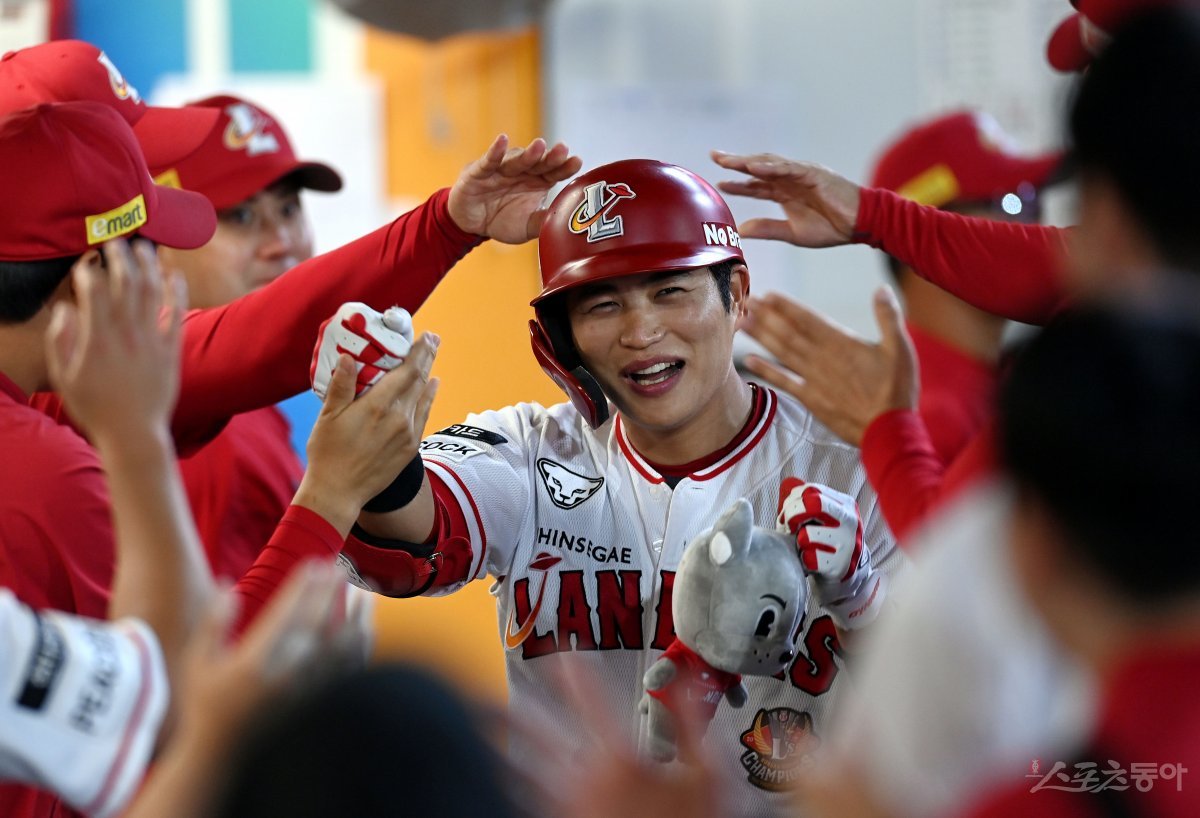 1일 인천 SSG 랜더스필드에서 ‘2023 신한은행 SOL KBO리그’ SSG 랜더스와 삼성 라이온즈의 경기가 열렸다. 7회말 2사 1루에서 SSG 김민식이 투런 홈런을 쏘아 올린 후 동료들의 환영을 받고 있다.