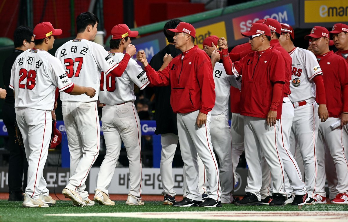 1일 인천 SSG 랜더스필드에서 ‘2023 신한은행 SOL KBO리그’ SSG 랜더스와 삼성 라이온즈의 경기가 열렸다. SSG가 삼성을 상대로 14-2로 승리하며 위닝시리즈를 기록한 후 선수들이 김원형 감독 및 코치들의 환영을 받고 있다.