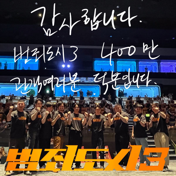 이에 ‘범죄도시3’의 배우 마동석, 이준혁, 아오키 무네타카, 김민재, 전석호, 안세호 그리고 이상용 감독은 한 극장에서 관객들과 함께 촬영한 400만 관객 돌파 감사 사진을 전했다. 배우 및 제작진 일동을 대표해 배우 마동석은 “감사합니다. ‘범죄도시3’ 400만 관객 여러분 덕분입니다”라고 직접 적은 손글씨로 관객들에게 감사 인사를 했다.