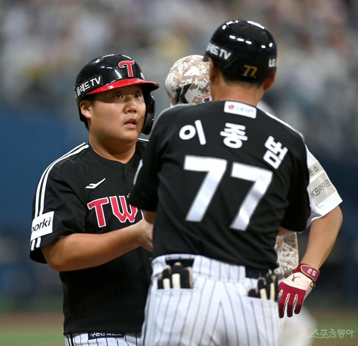 6일 서울 고척스카이돔에서 ‘2023 신한은행 SOL KBO리그’ LG 트윈스와 키움 히어로즈 경기가 열렸다. 3회초 1사 LG 김범석이 볼넷으로 출루하고 있다.