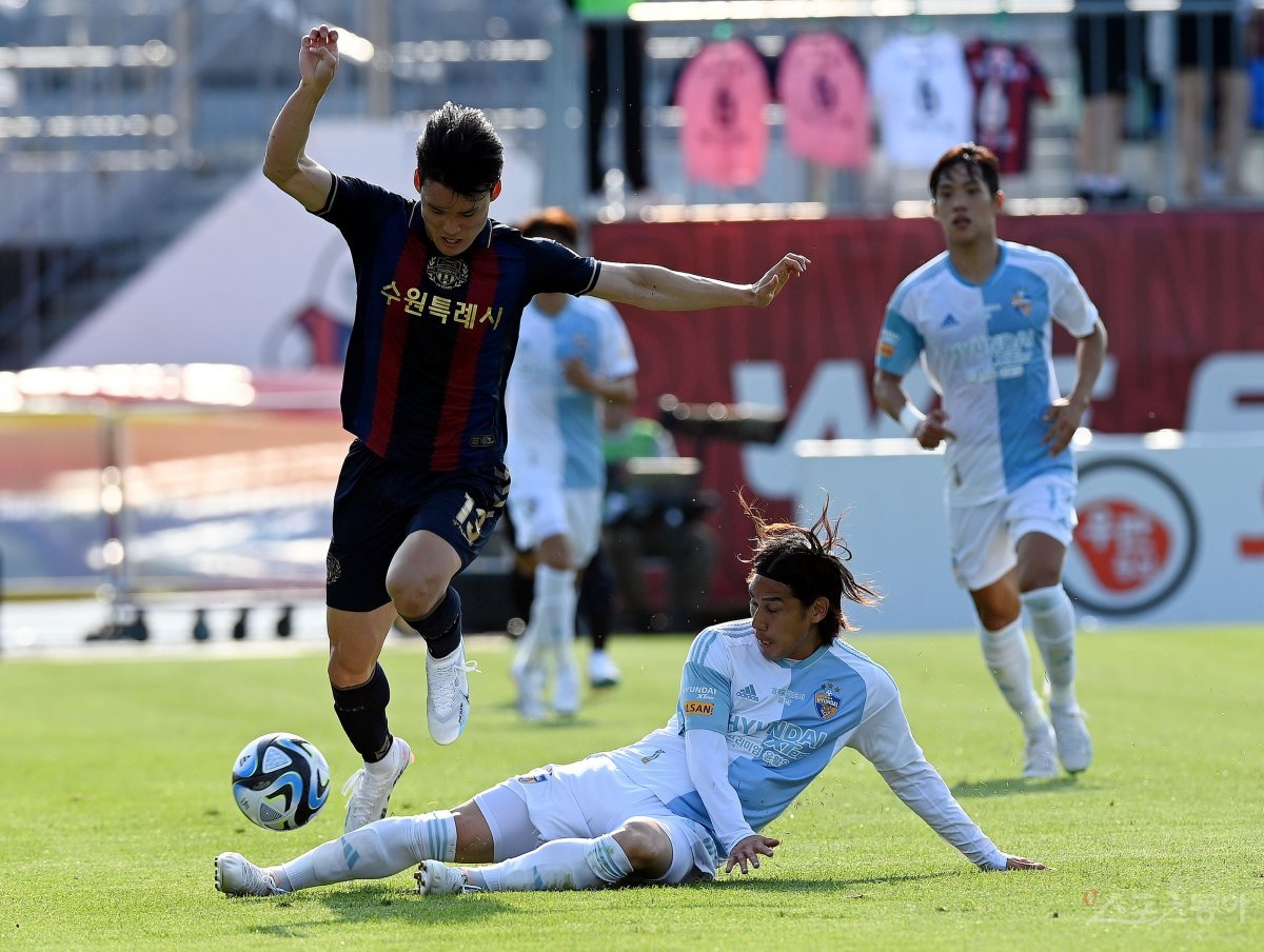 6일 경기도 수원종합운동장에서 열린 ‘하나원큐 K리그1 2023’ 수원 FC와 울산 현대의 경기에서 수원 FC 오인표가 울산 수비수의 태클을 피해 돌파하고 있다.