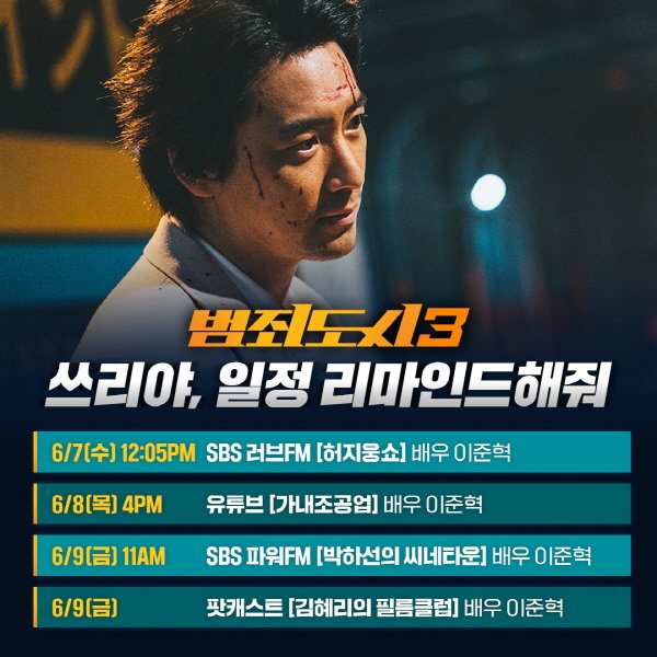 6월 9일(금) 오전 11시에는 SBS 파워FM ‘박하선의 씨네타운’에 출연해 영화에 대한 즐거운 수다를 이어갈 전망이다. 마지막으로 같은 날에 공개되는 SBS 팟캐스트 ‘김혜리의 필름클럽’에서는 영화에 대한 심도 깊은 이야기를 나눌 예정이다. 개봉 2주차에도 쉬지 않는 열혈 홍보를 이어가고 있는 이준혁의 활약으로 '범죄도시3'는 계속해서 관객들의 발걸음을 극장으로 불러 모을 것이다.