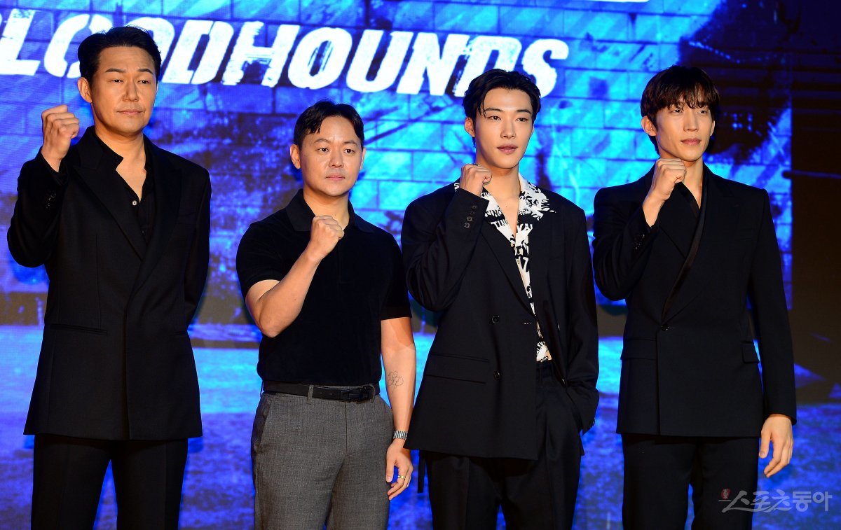 7일 서울 마포구 호텔 나루 엠갤러리에서 넷플릭스 시리즈 ‘사냥개들’ 제작발표회에 참석한 박성웅, 김주환 감독, 우도환, 이상이가 포즈를 취하고 있다.
