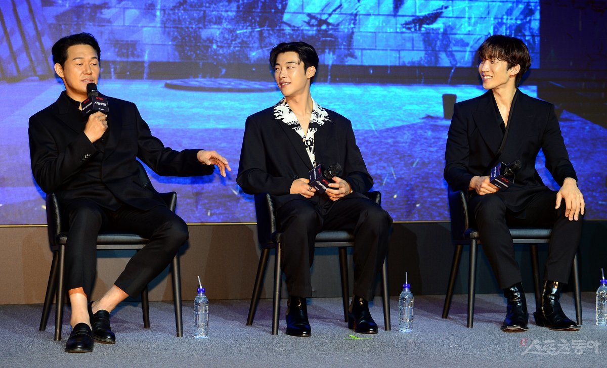 7일 서울 마포구 호텔 나루 엠갤러리에서 넷플릭스 시리즈 ‘사냥개들’ 제작발표회에 참석한 박성웅, 우도환, 이상이가 촬영 소감을 밝히고 있다.