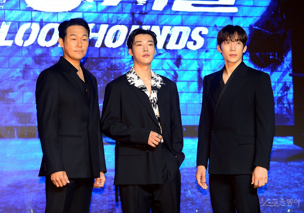 7일 서울 마포구 호텔 나루 엠갤러리에서 넷플릭스 시리즈 ‘사냥개들’ 제작발표회에 참석한 박성웅, 우도환, 이상이가 포즈를 취하고 있다.