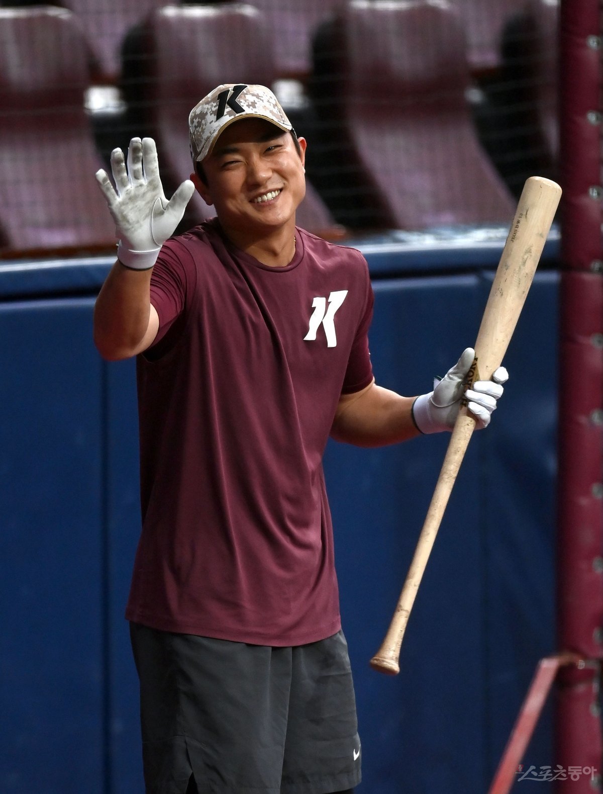 7일 서울 고척스카이돔에서 ‘2023 신한은행 SOL KBO리그’ LG 트윈스와 키움 히어로즈 경기가 열린다. 훈련 중 키움 김태진이 웃고 있다.