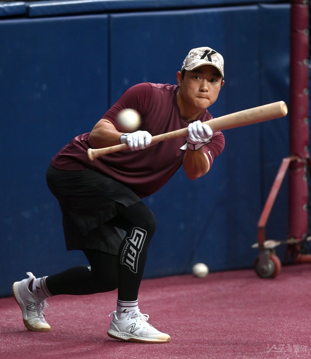 7일 서울 고척스카이돔에서 ‘2023 신한은행 SOL KBO리그’ LG 트윈스와 키움 히어로즈 경기가 열린다. 키움 김재진이 번트 훈련을 하고 있다.