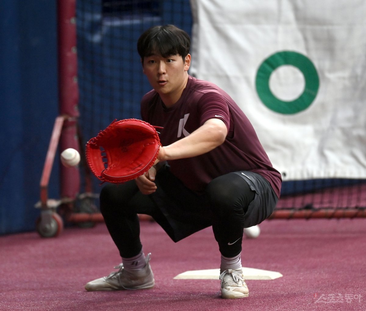 7일 서울 고척스카이돔에서 ‘2023 신한은행 SOL KBO리그’ LG 트윈스와 키움 히어로즈 경기가 열린다. 키움 김동헌이 수비 훈련을 하고 있다.