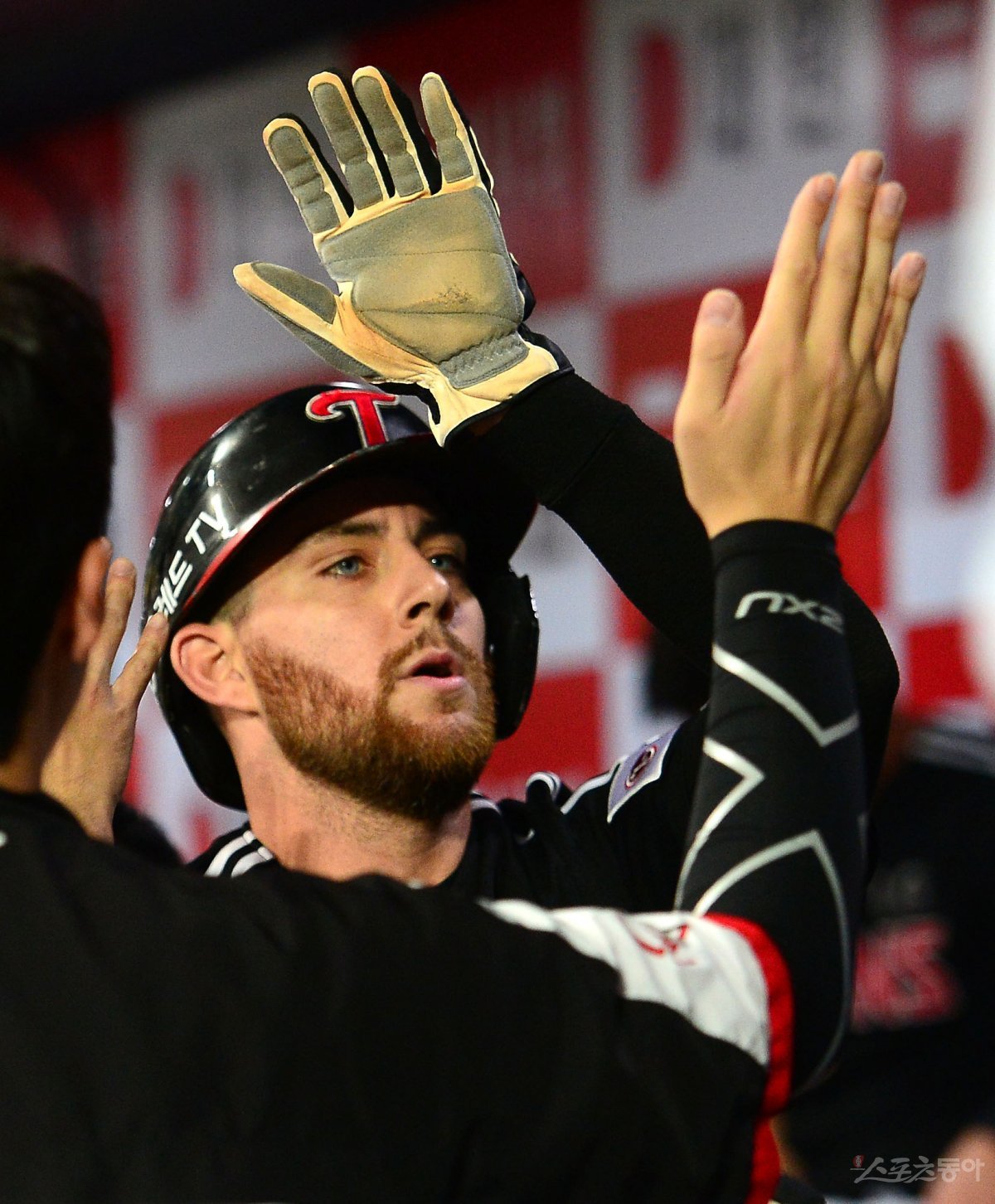 7일 서울 고척스카이돔에서 ‘2023 신한은행 SOL KBO리그’ LG 트윈스와 키움 히어로즈 경기가 열렸다. 2회초 1사 만루 LG 내야 땅볼 때 득점한 3루주자 오스틴이 더그아웃에서 하이파이브 하고 있다.