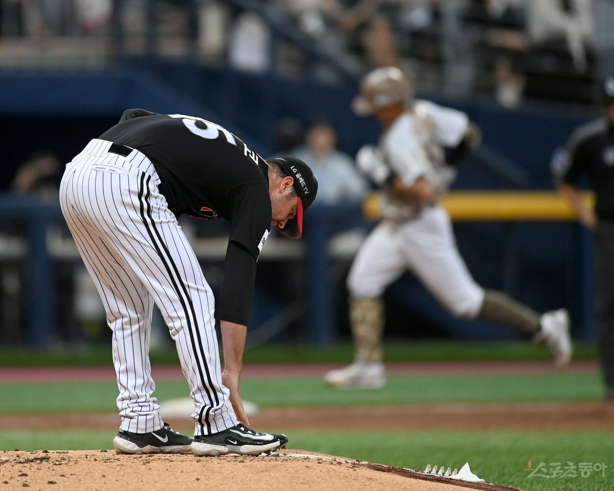 7일 서울 고척스카이돔에서 ‘2023 신한은행 SOL KBO리그’ LG 트윈스와 키움 히어로즈 경기가 열렸다. LG 선발 플럿코가 3회말 1사 키움 이정후에게 역전 우월 솔로 홈런을 허용하고 있다.