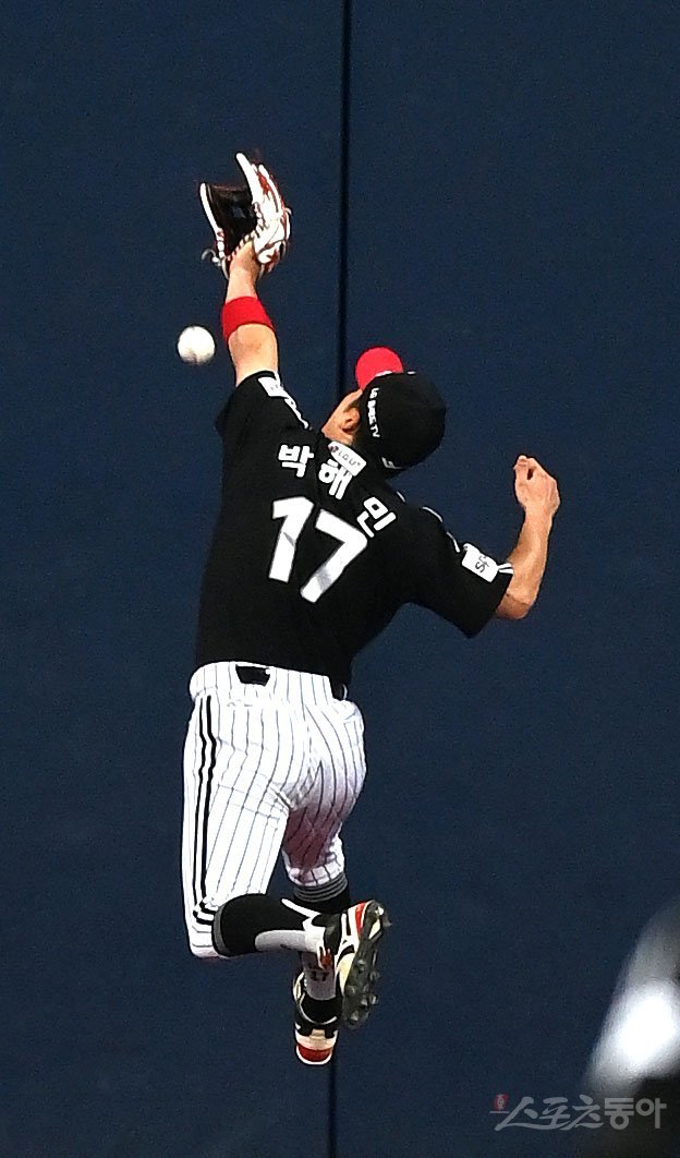 7일 서울 고척스카이돔에서 ‘2023 신한은행 SOL KBO리그’ LG 트윈스와 키움 히어로즈 경기가 열렸다. 2회말 2사 LG 박해민이 펜스 앞까지 달려가 공을 잡으려했으나 놓치고 있다.