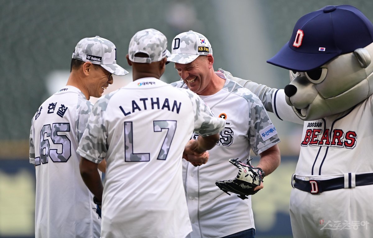 7일 서울 잠실야구장에서 열린 ‘2023 신한은행 SOL KBO리그’ 두산 베어스와 한화 이글스의 경기에 앞서 한미연합 미2보병사단 2스트라이크 강연철 부여단장과 레이먼드 레이튼 주임원사, 채드 로어먼 여단장이 호국보훈의 달을 맞은 시구, 시타, 시포를 마친 후 악수하며 기뻐하고 있다.