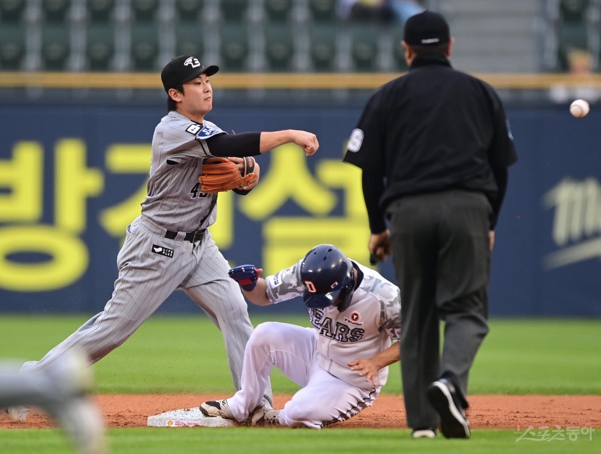 7일 서울 잠실야구장에서 열린 ‘2023 신한은행 SOL KBO리그’ 두산 베어스와 한화 이글스의 경기에서 1회말 무사 1, 2루 두산의 내야 땅볼 때 한화 정은원이 1루주자를 포스 아웃시킨 후 1루로 송구하고 있다.