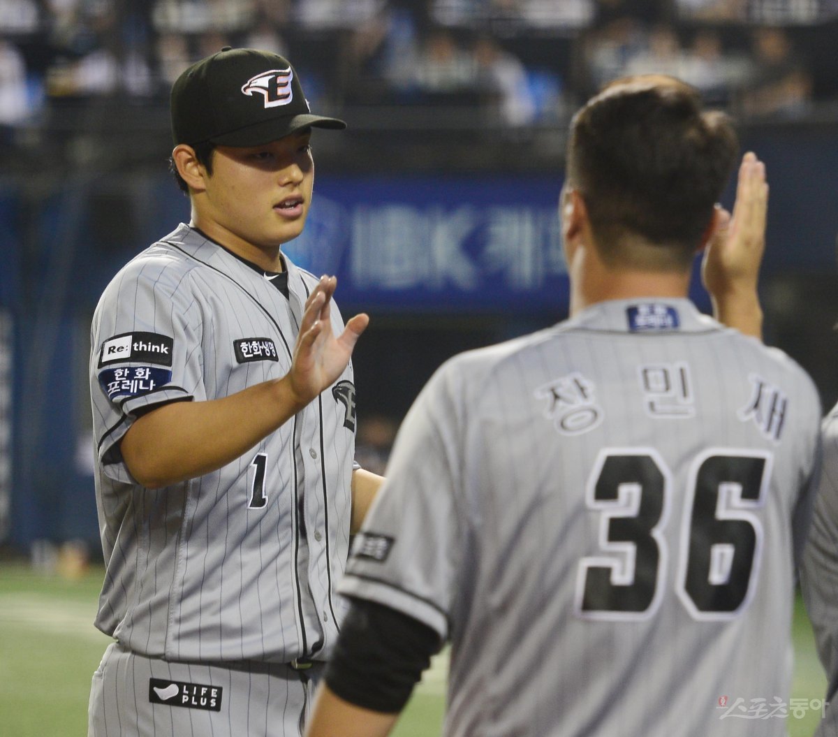 7일 서울 잠실야구장에서 열린 ‘2023 신한은행 SOL KBO리그’ 두산 베어스와 한화 이글스의 경기에서 6회말 수비를 마친 한화 문동주가 더그아웃 앞에서 동료들과 기쁨을 나누고 있다.