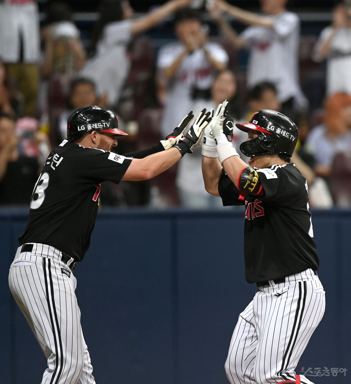 7일 서울 고척스카이돔에서 ‘2023 신한은행 SOL KBO리그’ LG 트윈스와 키움 히어로즈 경기가 열렸다. 8회초 2사 2루 LG 박동원이 동점 좌월 투런 홈런을 날린 후 그라운드를 돌아 홈인하고 있다.
